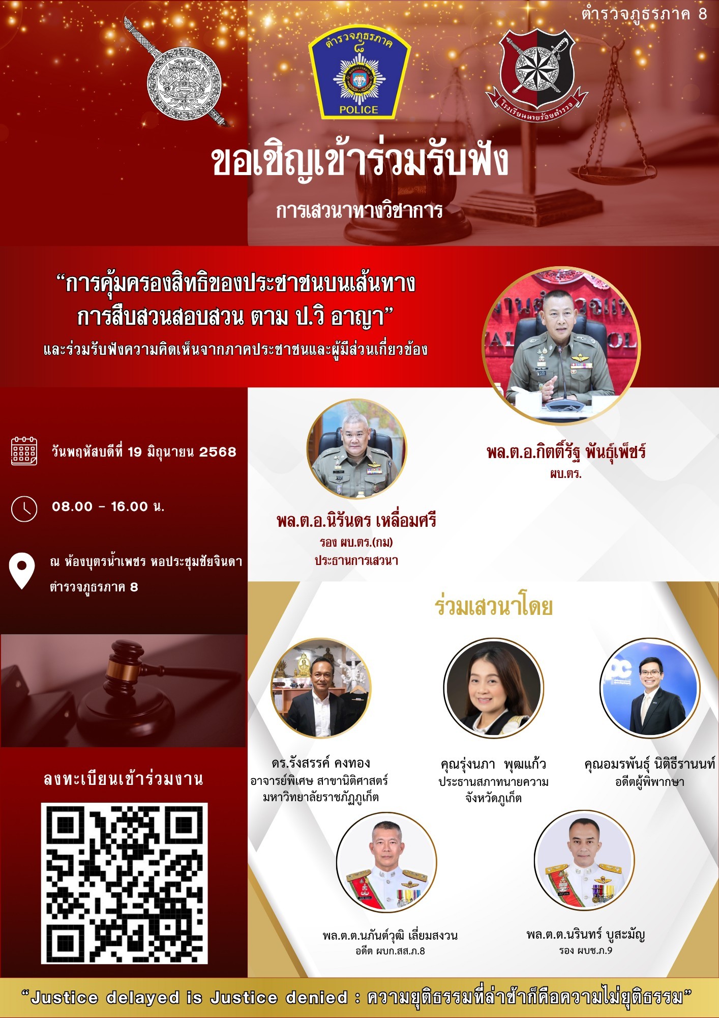 🚨 ตำรวจภูธรภาค 8 ขอเชิญชวนประชาชนและข้าราชการตำรวจเข้าร่วมรับฟัง การเสวนาวิชาการ “การคุ้มครองสิทธิของประชาชนบนเส้นทางการสืบสวนสอบสวน ตาม ป.วิอาญา”